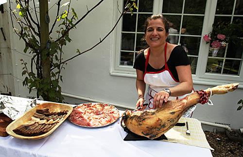 Rowie and Ros took charge on the day, both of them experienced in open fire cooking and Spanish food. Begona also came to carve the Serrano ham. Rowie started on the pan con tomate which she made in front of guests, rubbing cloves of garlic on fire toasted ciabatta, then adding tomato (grown by her own newly scrubbed hands) salt and pepper and olive oil. As Begona carved, guests helped themselves to the serrrano, either putting it on top of the pan con tomate or straight into their mouths.