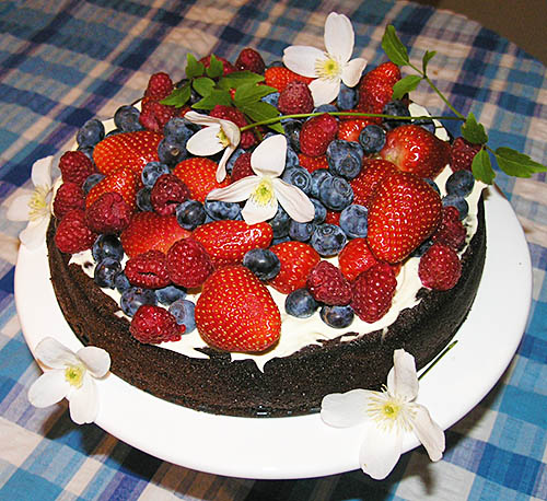 Not only is it full to the gunnels of dark and moist chocolate but it also has plenty of fresh fruit as well to keep everyone happy. We take a whole cake to each table with a vintage cake slicer. Adrian and Sarah Garrett had a brilliant idea of serving this to half the tables, and the other half caramelized apple tarts with Guernsey cream.
