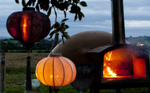 Pudding could not be simpler – bowls of strawberries, raspberries and apricots with jugs of cream. Later on we cast some logs into our wood fired pizza oven and baked late night pizzas under the faint light emanating from Chinese lanterns threaded on the trees in the orchard and the rising moon.