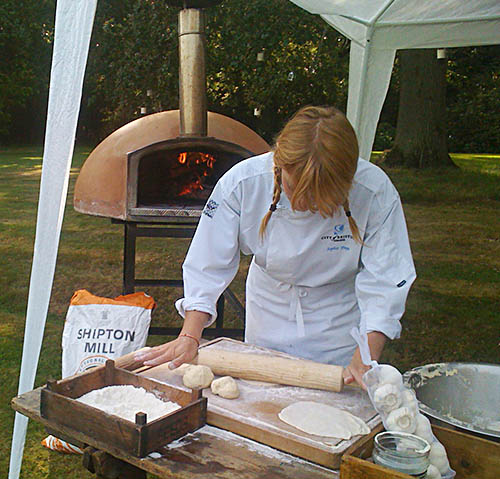 Later on in the day, and once the flames of the fire had died down a little, Rowie started on the organic mini burgers, putting them on the bottom tripod first to cook, then moving them up a bit to keep warm. As the guests asked for them so Ros prepared them, in little baps made especially for us by Thierry at La Parisienne, and adding some tomato, chilli, red onion, lime and coriander salsa and lettuce to make them extra juicy. We made special burgers for the vegetarians as well but they had to be cooked conventionally! A guitar player serenaded them, up came the stars and Rowie and Ros finally left to great applause from the crowd.
